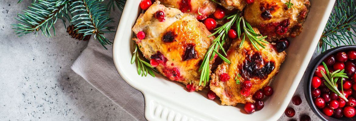 Check to make sure the internal temperature of the thickest part of the chicken is 165F. Once fully cooked, spoon the sauce and cranberries from the pan onto each chicken thigh/breast and sprinkle with cracked pepper and fresh sprigs of thyme.
