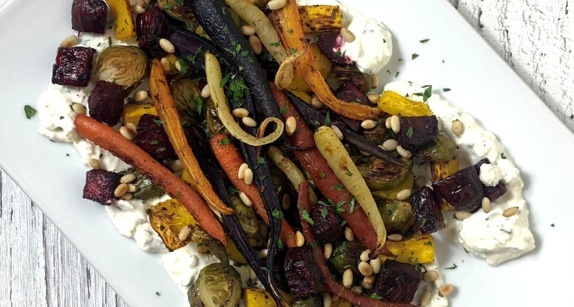 This dish offers a delicious and colorful way to enjoy seasonal winter vegetables, which are packed with many beneficial antioxidants such as betanin, carotenoids, alpha-lipoic acid, and vitamin C. Additionally, the creamy whipped feta and Greek yogurt provide an excellent protein and calcium boost, while taking this recipe to new flavor heights.