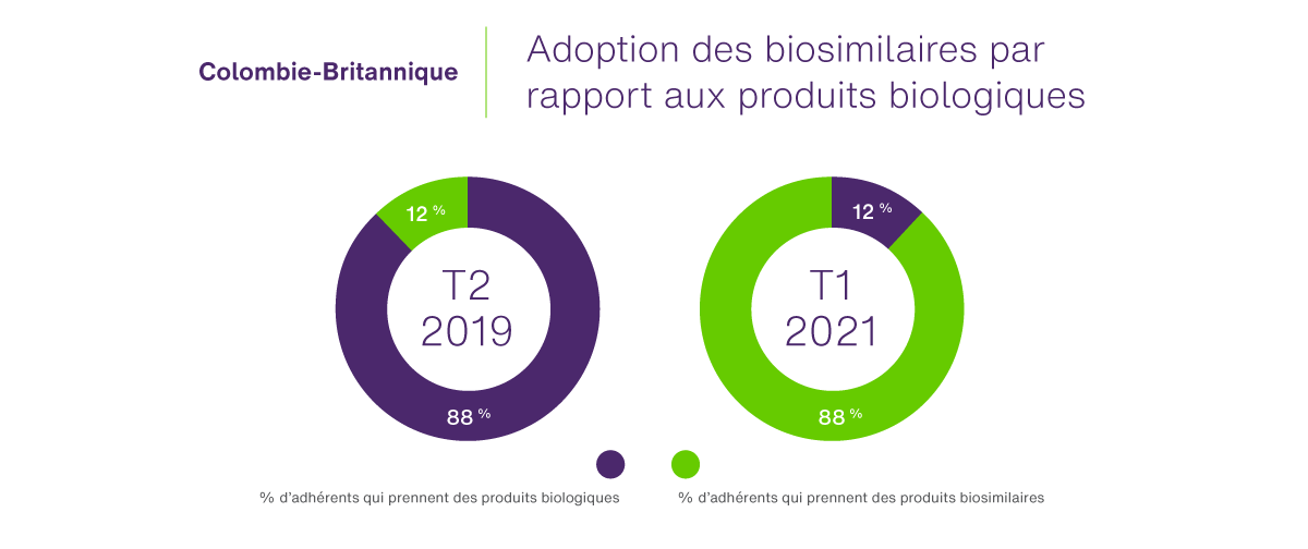 La Colombie-Britannique a été la première à mettre en œuvre une stratégie à compter de la fin 2019, après une période de transition de six mois; compte tenu du programme universel PharmaCare de la province, les données sur les demandes de règlement de TELUS Santé illustrent un virage marqué vers les biosimilaires pour les régimes publics et privés.